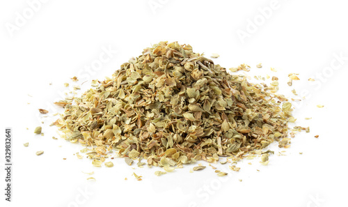Pile of dried oregano leaves isolated on white background