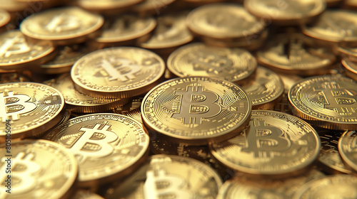 Pile of Golden Bitcoin Coins: Gleaming close-up view of numerous Bitcoin tokens stacked with prominent engravings in a warm golden light.