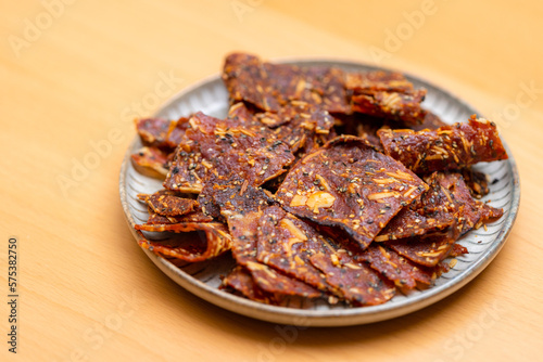 Pile of sliced crispy pork jerky