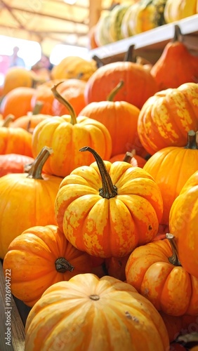 Pile of vibrant orange pumpkins with gourds, close-up, fall harvest bounty, vertical