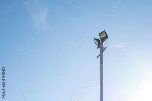 pillar with two projectors against a blue sky
