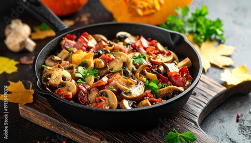 speck, champignon, cep, chanterelle, hearty, dinner, rustic, pan, cast iron, warm, autumn, traditional, aromatic, kitchen, close-up view, local, cooking, simply, aromatic, steamy, enjoyment, seasonal, wooden board, speciality, powerful