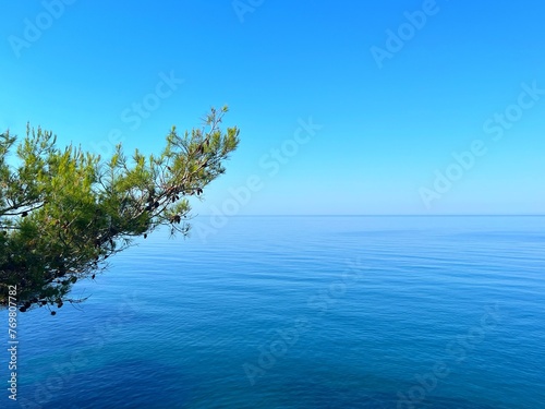 Pine branch above blue sea calm water and clear sky.
