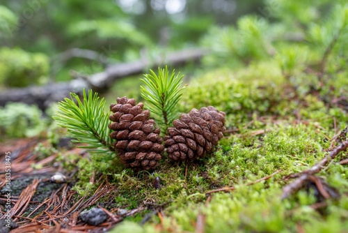 Pine cones on moss in a forest setting during the day