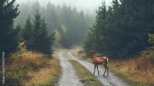 Pine forest road with deer crossing, wildlife and nature in harmony