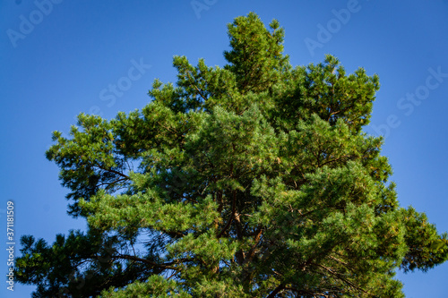 Pine Pinus silvestris against blue autumn sky. Evergreen landscaped garden. Sunny day in autumn garden. North Caucasus nature concept for design.