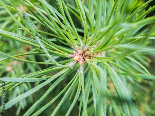 Pine resin on needles, fir branch with drops of tree resin. Details of the nature spruce forests. Pine resin on the needles.