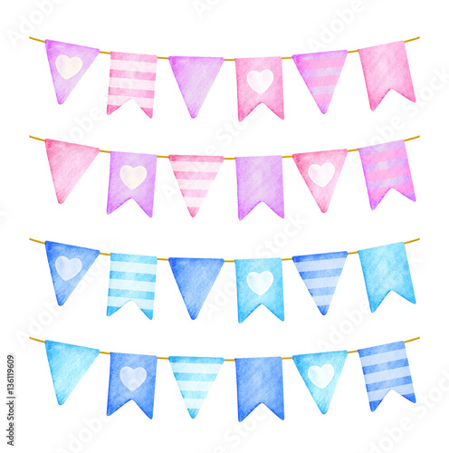 Pink and blue flags garland. Birthday celebration. Watercolor illustration