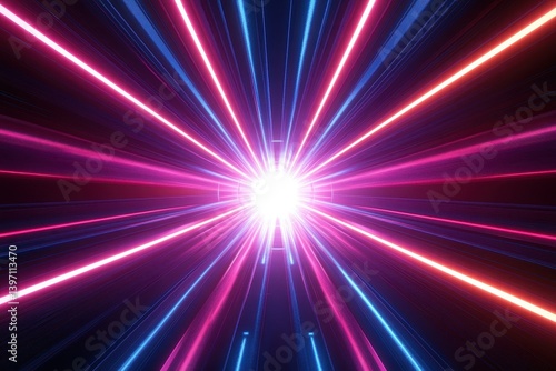 Pink and blue glowing light streaks converge towards a central bright light. Ideal for technology, futuristic designs, or a burst of creative energy.