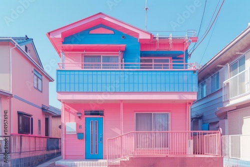 Pink and blue japanese house with balcony and porch under a clear blue sky, surrounded by other colorful houses