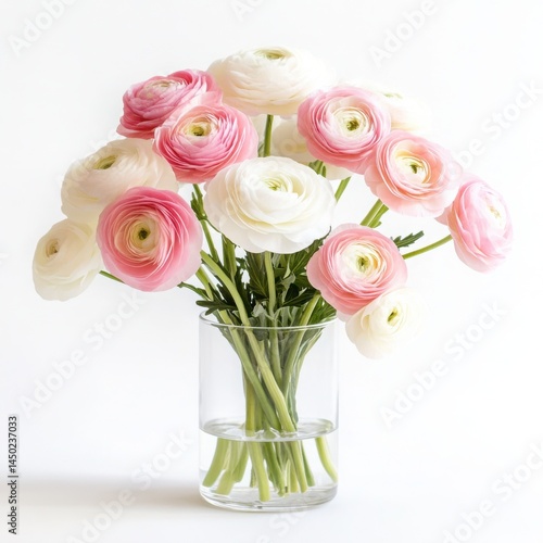 ranunculus, flower, bouquet, vase, pink, white, blossom, floral, bloom, arrangement, glasses, stem, beauty, spring, flora, nature, elegant, fresh, delicate, clear, create, vibrant, display, honed