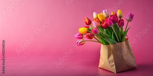 Pink Background Tulips Bouquet in Bag - Spring Flowers Stock Photo