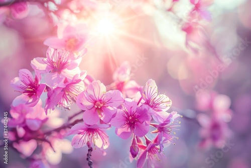 pink blooming sakura tree in spring, ray of bright morning sunshine cuts through gloomy clouds and backlights the tree