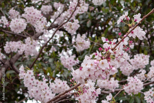 Pink cherry blossom tree flowers and branches closeup. Photo taken in Jinhae, South Korea