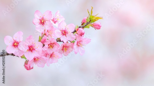Pink cherry blossoms branch, spring garden, soft focus background, floral design