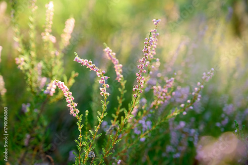 Pink common heather (Calluna vulgaris) blossoming outdoors.