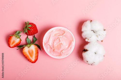 pink cream or face mask, fresh ripe strawberries and cotton on a pink background. The concept of natural cosmetics. Beauty concept. flat lay, closeup.