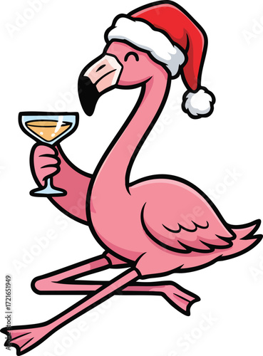 flamingo, pink flamingo, bird, tropical bird, christmas, christmas, holiday, seasonal, festive, celebration, party, cocktail, martini glass, martini, drink, beverage, toast, cheer, cute, whimsical, funny, winking, smiling, character, mascot, cartoon, illustration, vector, clip art, colourful, pink, isolated, white background, vacation, beach, resort, relaxed, drinking, new year, holiday greeting, hand-drawn