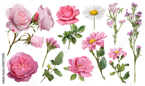 pink, floral, arrangement, rose, daisy, flower, stem, leaf, bud, green, white, illustration, decorative, nature, spring, summer, pretty, beautiful, design, collection, digital, art, image, vector, graphic, element, botanical, flower, detail, soft, colours, pastel, close, up, bouquet, vintage