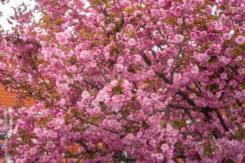 Pink flowering Japanese cherry (sakura) in spring. Beautiful branches of pink Cherry blossoms in the garden. Seasonal spring scenery. Nature floral background