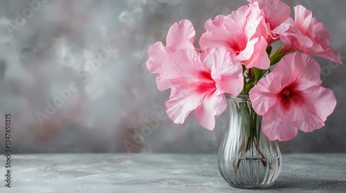 Pink flowers in glass vase, grey background, floral arrangement, home decor, greeting card