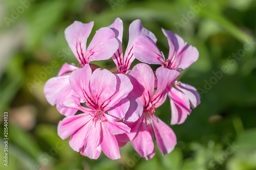 Pink geranium flowers in bloom in garden.