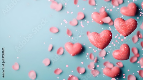 heart, pink, love, february 14, romance, background, texture, confetti, flower petals, rose petal, pastel, romantic, celebration, wedding, anniversary, design, abstract, soft, gentle, feminine, beautiful, elegant, delicate, dreamy, light, airy, blue background, holiday, greeting card, invitation