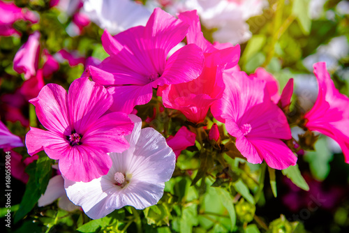 Pink lavater flowers on a green natural background