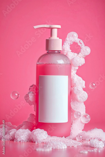 Pink Liquid Soap Bottle with Bubbles on Pink Background