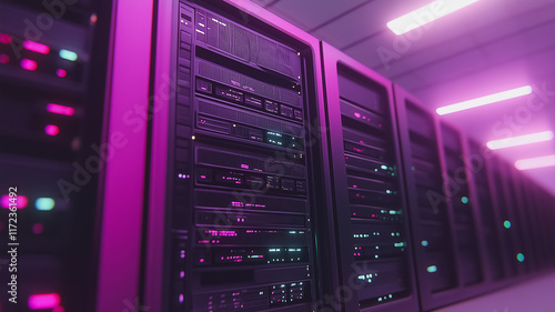 Pink Neon Server Room: A row of sleek server racks bathed in vibrant pink neon light, creating a futuristic and visually striking image of technological infrastructure.