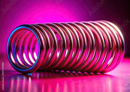 Pink night: a metallic spring glows, dramatic shadows accentuate its industrial form.