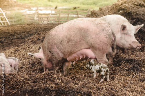 pink parent pigs are suckling a little colorful bentheimer pig at farm background