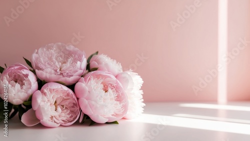 Pink Peony Flowers with Copy Space on a Pink Background.