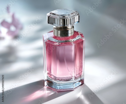 perfume, bottle, pink, fragrance, glasses, luxury, beauty, cosmetic, elegant, aroma, liquid, faceted, cap, shiny, crystal, scent, glamour, style, design, product, still, life, surface, bright, modern, art, closeup, white, background, with, light, image, essence, composition, isolated, digital, creative, conceptual