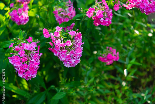 Pink phlox bushes in the park. Selective focus on a beautiful bush of blooming flowers and green leaves under sunlight in summer. Village theme in nature. Greeting card, invitation and border mockup.