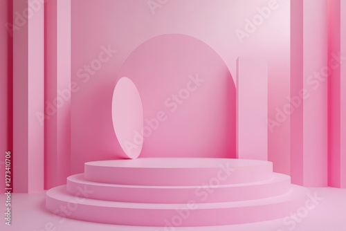 Pink podium stage for product display with geometric shapes on light pink background, presentation