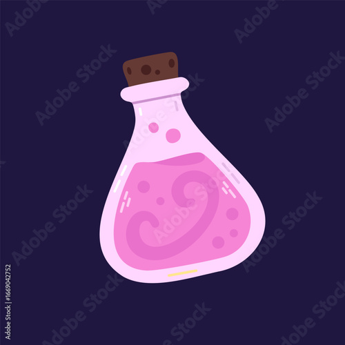 Pink potion bottle with swirling magical liquid. Vector isolated design
