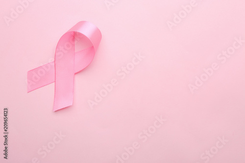Pink ribbon on color background. Breast cancer concept