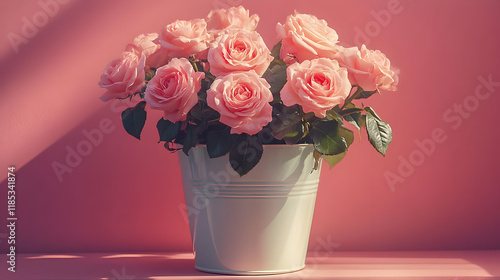 rose, pink, flower, bouquet, bucket, romantic, love, valentine, beauty, floral, spring, summer, wedding, gift, celebration, decoration, pretty, fresh, bloom, nature, plant, light, sunshine, background, design, image, photo, photo, still life, arrangement, colours, romance, tenderness, delicate, elegant, stylish, pastel, macro, closeup, blossom, high-coloured, bright, affection