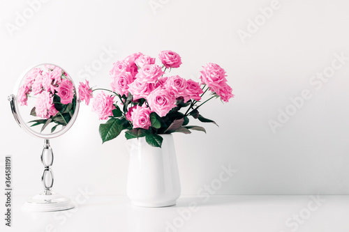 Pink roses in vase reflected in mirror. Light white bathroom decor, mirror, pink roses flowers on white shelf. Elegant decor bathroom interior.
