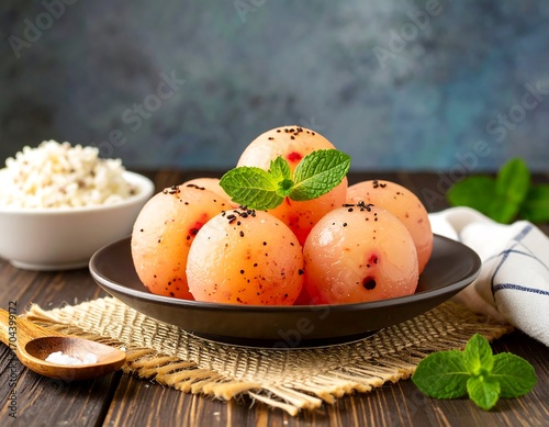 sphere, pink, food, plate, bowl, grain, mint, dark, wooden, texture, dessert, sweet, fresh, tasty, healthy, closeup, delicious, round, light, food photography, appetising, arrangement, natural, rustic, smooth, pale, dot, spiced