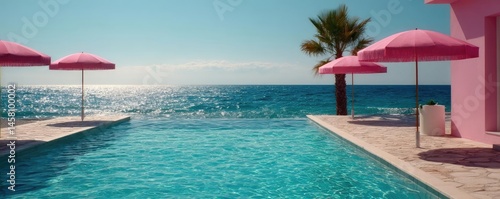 Pink summer vacation under parasol with swimming pool view concept. Relaxing poolside retreat with vibrant umbrellas and ocean views.
