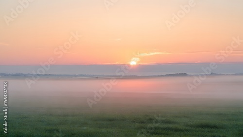 Pink Sunrise Over Foggy Field – Tranquil Early Morning Landscape with Mist