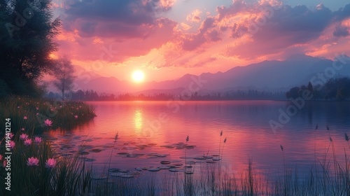 sunset, lake, mountain, pink, cloud, sky, water, tree, landscape, serene, peaceful, calm, tranquil, idylli, nature, beauty, gorgeous, majestic, vibrant, colourful, sunrise, evening, dusk, dawn, summer, warm, magical, picturesque, lily