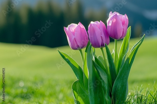 Pink tulips in the grass, with a bokeh background, sunlight and sun rays shining through the petals of purple flowers, set against a green meadow. Nature photography capturing the essence of