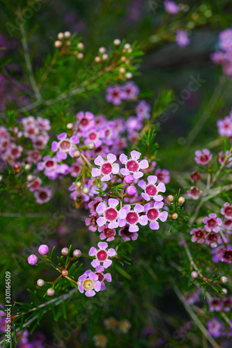 Pink waxflowers (Chamelaucium) growing on a shrub
