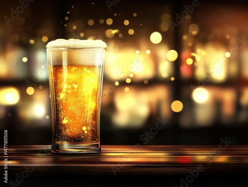 Pint of golden beer with foam resting on a wooden bar top in a pub with bokeh lights in the background