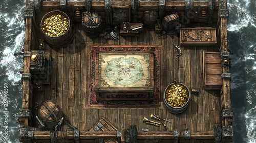 treasure, map, gold, coin, ship, deck, pirate, ocean, sea, adventure, journey, exploration, travel, navigation, cartography, nautical, maritime, wooden, chest, barrel, rug, carpet, table, item, object, overhead, view, game, asset, illustration, design, fantasy, fiction, art, digital, graphic, vintage, antique, aged, weathered, old, rich