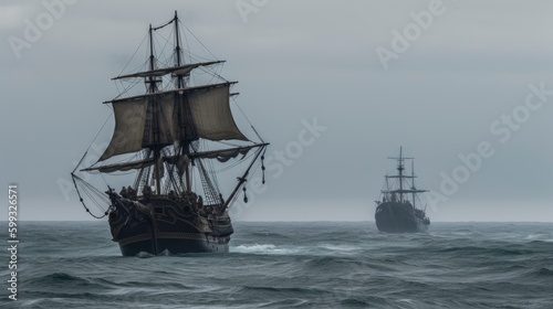 Pirate ship in stormy sea. Tall ship in stormy sea. Battle