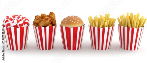 fast food, french fries, burger, popcorn, container, food photography, digital artwork, illustration, graphic design, food, snack, meal, dinner, lunch, party, celebration, delicious, tasty, appetising, crispy, juicy, savoury, sweet, salty, crunchy, white background, studio shot, isolated, closeup, topview, half face, colourful, vibrant, bright, red, white, gold, brown, texture, pattern, design, simple, minimal, clean, modern